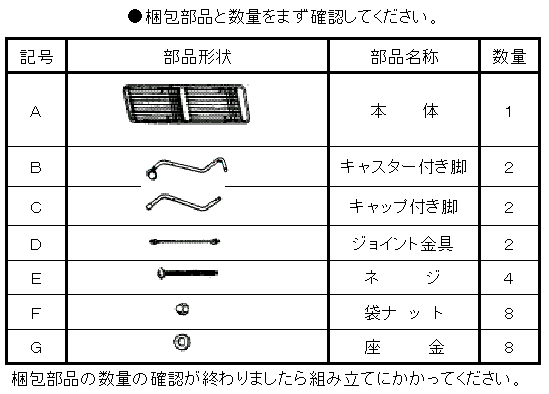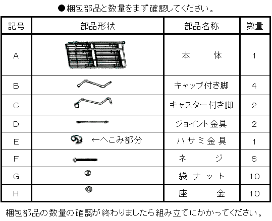 | A | 手順1 1.まず、本体Aの包装紙を取らないで台にのせてフレームをひろげてください。 2.キャップ付き脚Bを本体Aに図のように組み、ネジで4箇所を仮止めしてください。 3.次に、キャスター付き脚Cと本体Aを図のように組み込んでネジで2箇所を確実に固定してください。