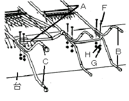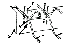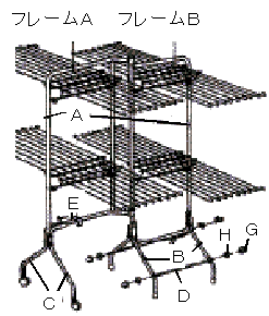 手順2 1.全体を立てて、ジョイント金具Dを左右のキャップ付き脚Bの穴にはめ込んだ後、図のようにナットで4箇所を確実に固定してください。 2.キャスター付き脚Cと本体Aのかん合部に図のようにクボミ部分を内側にしてハサミ金具Eをはめ込んでください。 3.キャップ付き脚Bと本体Aの仮止め箇所を確実に固定してください。 |